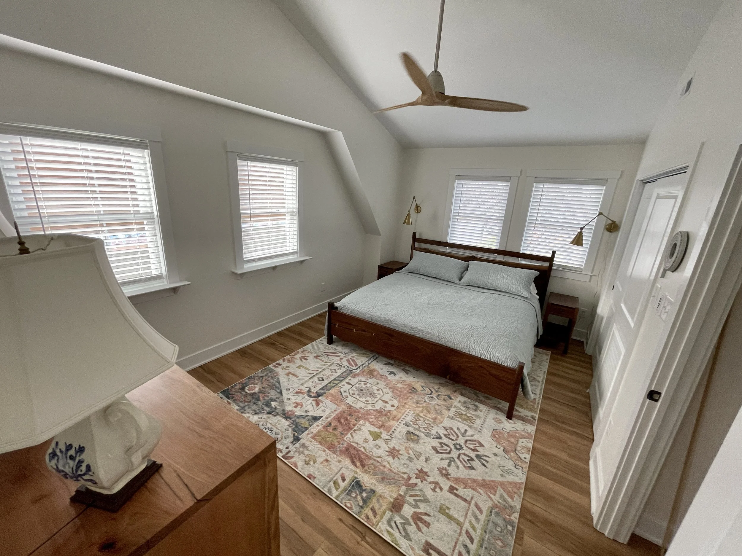 This king-sized bed is crafted out of gorgeous walnut and has a slight but beautiful live edge headboard. The chamfered edges, maple bowties, and natural finish really make this bed pop!